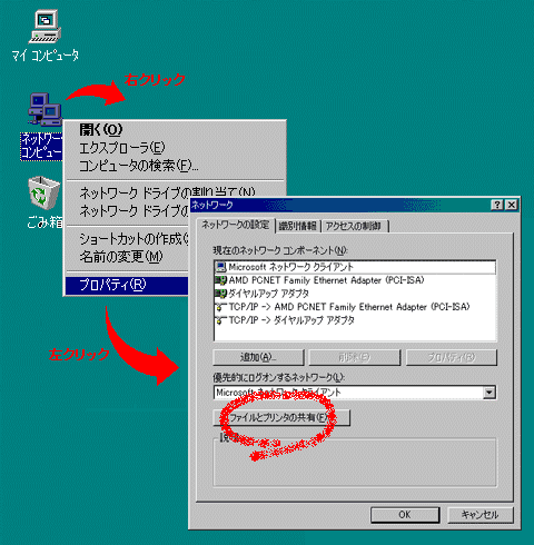設定方法はデスクトップ画面上の「ネットワークコンピュータ」を右クリックし、「プロパティ」を実行すると以下のようなダイアログが表示されますので、「ファイルとプリンタの共有」ボタンをクリックしてファイル共有を設定してください。