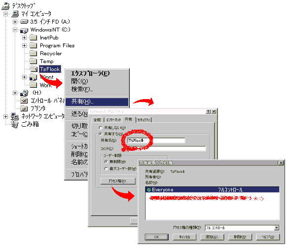 - フォルダーはサーバーパソコン上のどこに作成してもかまいませんが、たとえばCドライブに「TsFlock」というフォルダーを作成します。次に Explorer で C:\TsFlock を右クリックし、「共有...」を実行して共有設定します。共有名として8文字以内の半角英数字を使用し、最後は$で終わる名前とします。(特に問題なければ TsFlock$ としてください。)また、共有権限は全てのユーザーに対してフルコントロールとします。