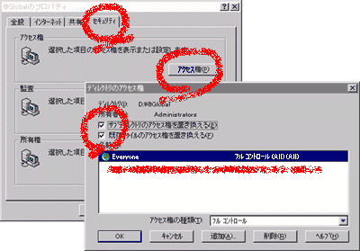 - WindowsNT/2000/Xp サーバーを使用して共有フォルダーを設定する場合、共有権限の他にセキュリティ権限も設定する必要があります。「セキュリティ」タグをクリックして、アクセス権を全てのユーザーに対してフルコントロールをします。