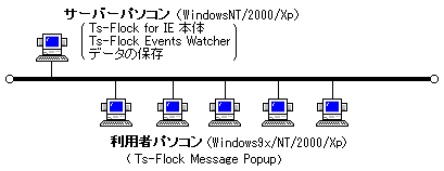 - Ts-Flock for IE の「本体モジュール」や「イベント処理ツール」をセットアップしたり、「データを保存」するパソコンであり、このパソコンをサーバーと呼びます。サーバーパソコンは、ネットワーク上に1台のみ用意し、複数台にセットアップしないようにしてください。
